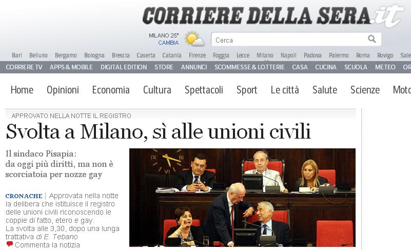 Il voto definitivo - 27 favorevoli, 7 contrari e 4 astenuti - è arrivato nella notte, poco dopo le tre e mezza, alla fine di un Consiglio comunale fiume durato undici ore e mezza (era iniziato alle 16,30). La delibera istituisce un registro a cui le coppie, sia etero che omosessuali, possono iscriversi contestualmente alla registrazione della famiglia anagrafica. «D’ora in poi nelle delibere comunali saranno parificate a chi è sposato. Anche le coppie gay - spiega Marco Mori, presidente di Arcigay Milano -. C’è voluto più tempo del previsto, ma il voto di questa notte è un segnale importante». (Corriere della Sera)